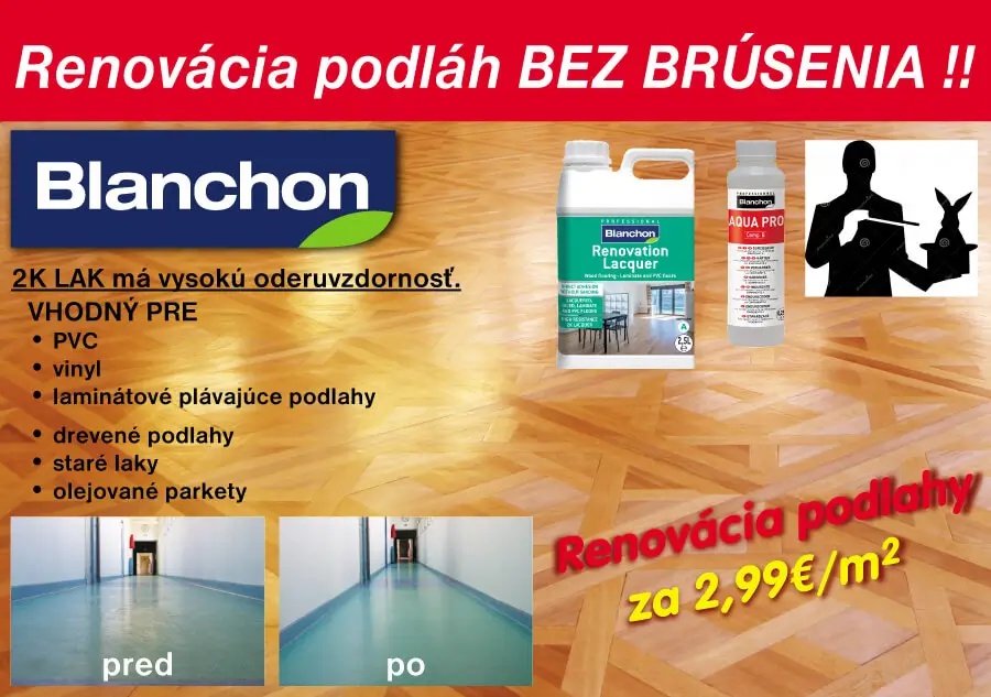 Firma R.Š. Plus je výhradným importérom značky Blanchon pre Českú a Slovenskú republiku. Našou filozofiou je v spolupráci s materskou firmou Blanchon ponúknuť zákazníkom 100% servis a tie najlepšie vysoko kvalitné ekologické produkty na ošetrenie parketových a drevených podláh.